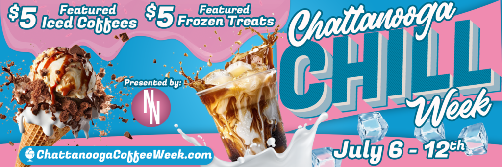 The 2nd Annual Chattanooga Chill Week is brewing in the Scenic City from July 6 - 12th 2026 ! Cool off with $5 Iced Coffees & $5 Frozen Treats around the Scenic City!