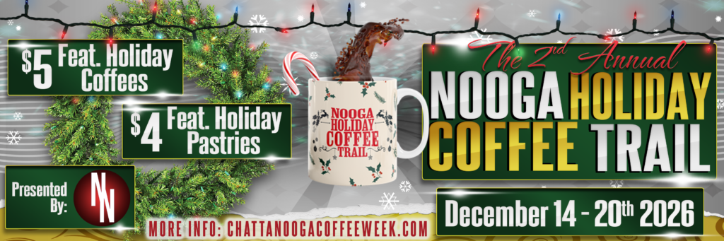 The Third Annual Nooga Holiday Coffee Trail is brewing in the Scenic City from December 154 - 20th 2026! After the Fall & Summer Coffee Weeks , we’re back with The last of the Year! Just in Time for the Cold Weather & Holidays!